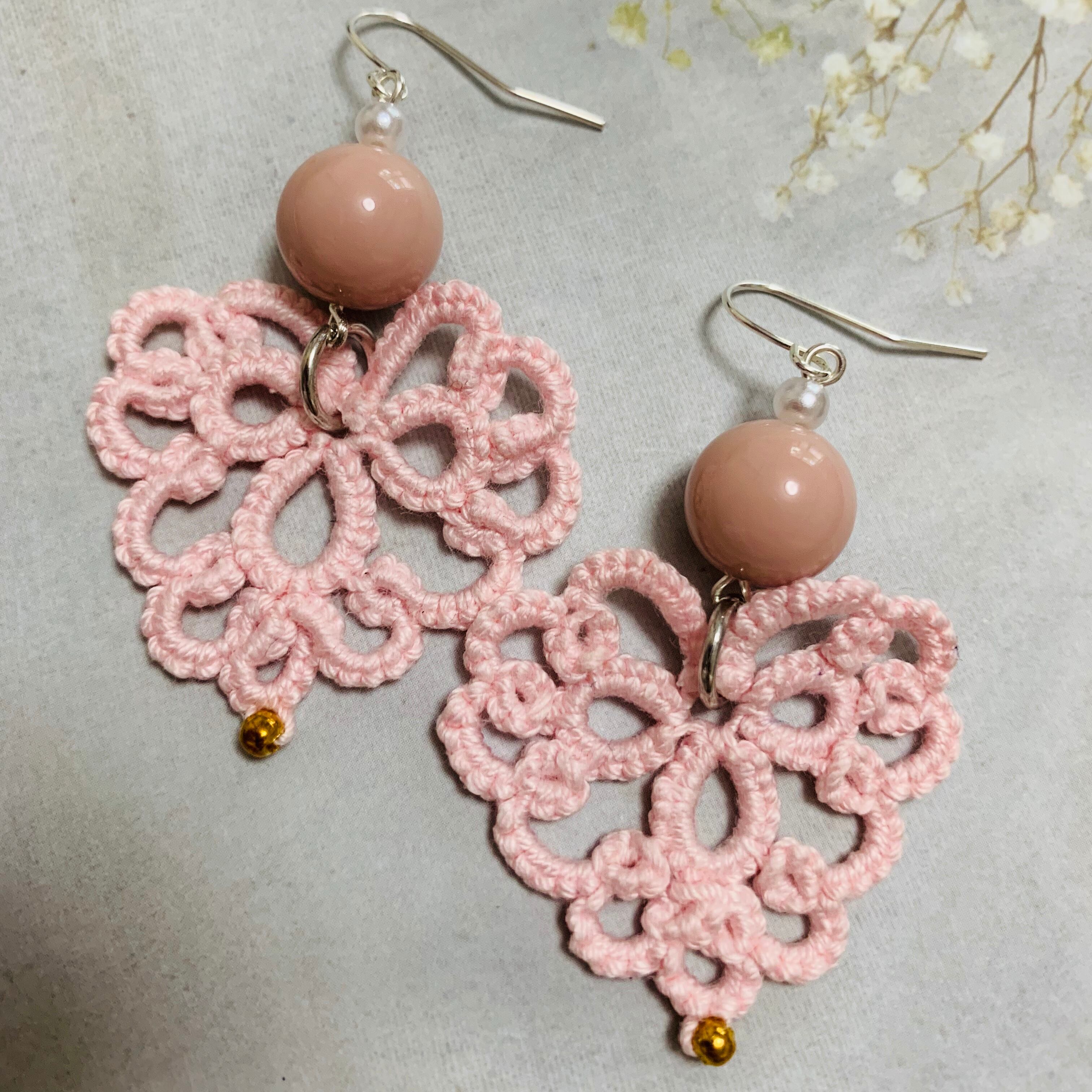 ライトピンク ピンクのレース糸でひと目ひと目ずつ編んだピアスです!